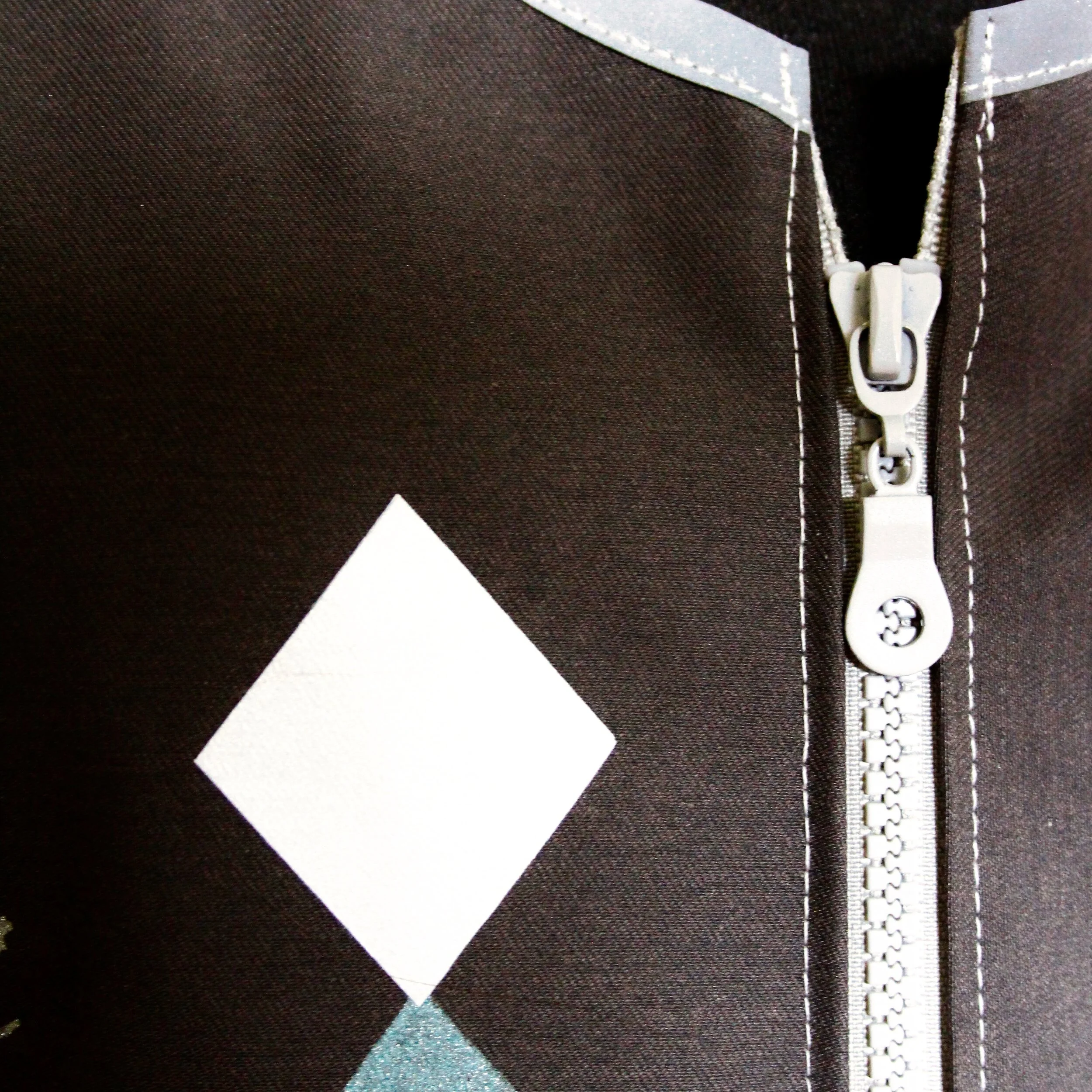 Anthracite reflective cycling vest made from hand-screenprinted material with diamond pattern and chunky zip. Different women’s and men’s sizes available. Each garment has been handmade at our workshop from durable polycotton with blue / turquoise / teal and reflective silver print, and silver retro-reflective trimmings and vinyl diamond shapes.
